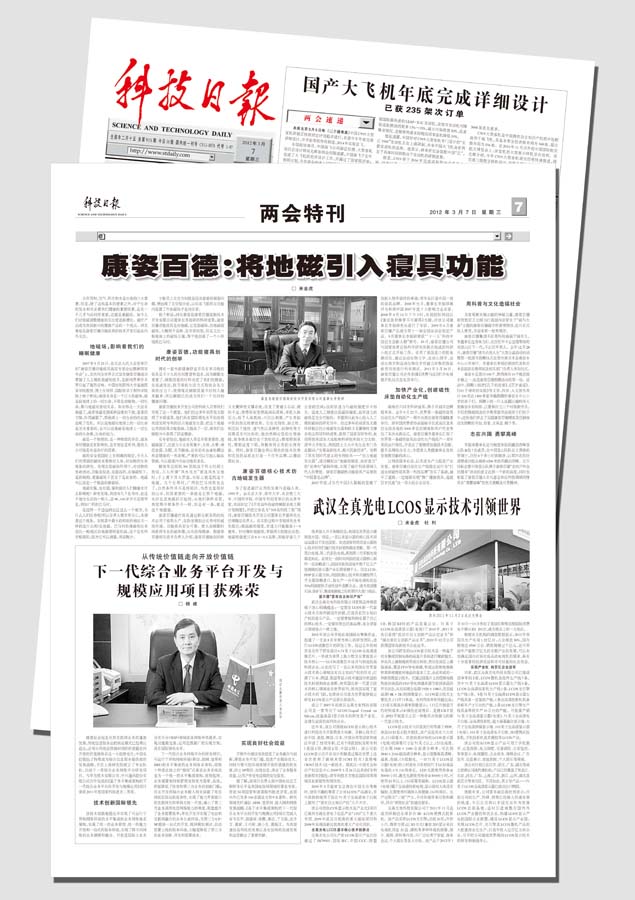 2012年3月7日,《科技日?qǐng)?bào)》兩會(huì)特刊對(duì)秦皇島康姿百德高新技術(shù)開發(fā)有限公司進(jìn)行了大篇幅的專題報(bào)道。整篇報(bào)道立體地展現(xiàn)了康姿百德磁性功能寢具的獨(dú)特優(yōu)勢(shì),全面地回顧了康姿百德輝煌的發(fā)展歷程。