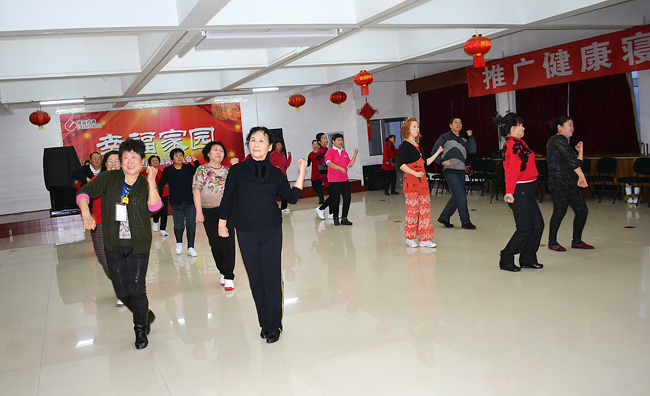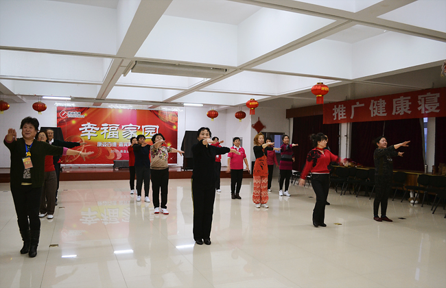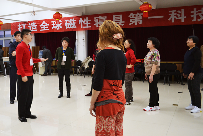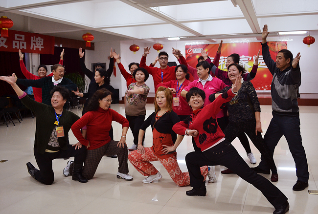 最早趕到康姿百德公司排練場地的是16位伴舞人員,都是50歲以上的中老年人。她們從早晨8點(diǎn)半開始便投入了一遍又遍地排練。每排練一遍,舞蹈老師都會進(jìn)行細(xì)微的糾正、調(diào)整隊(duì)形和調(diào)動情緒。每位健身操隊(duì)員也沒有因?yàn)榉磸?fù)的走位表現(xiàn)出疲憊或煩躁,始終面帶笑容,激情勃勃的投入排練。因?yàn)橥度氲倪\(yùn)動量非常大,很多人都是滿頭大汗,演員們就索性脫下厚實(shí)的棉衣輕裝上陣。