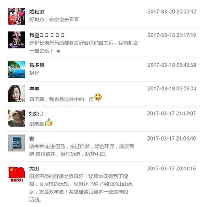 此次“走進(jìn)長(zhǎng)壽巴馬 共譜健康人生”健康之旅活動(dòng)反響熱烈,得到了健身愛好者的廣泛好評(píng)。自前幾篇報(bào)道巴馬健康之旅的文章發(fā)出后,許多健身愛好者都通過(guò)在微信公眾平臺(tái)文章下方留言評(píng)論的方式表達(dá)了自己的體會(huì)和感受。