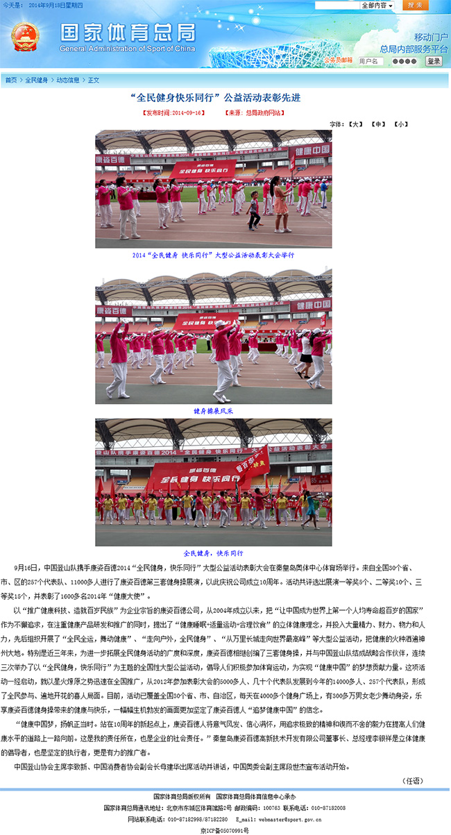 國家體育總局官網以《“全民健身快樂同行”公益活動表彰先進》為題,對中國登山隊攜手康姿百德2014“全民健身 快樂同行”大型公益活動表彰大會進行報道。