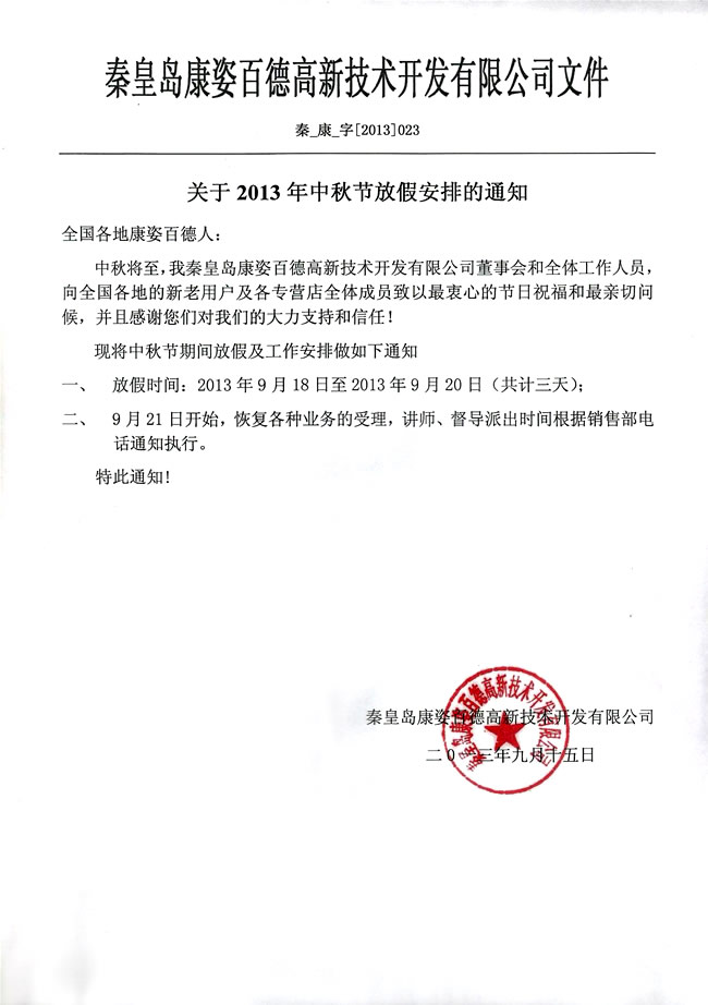 關(guān)于2013年中秋節(jié)放假安排的通知