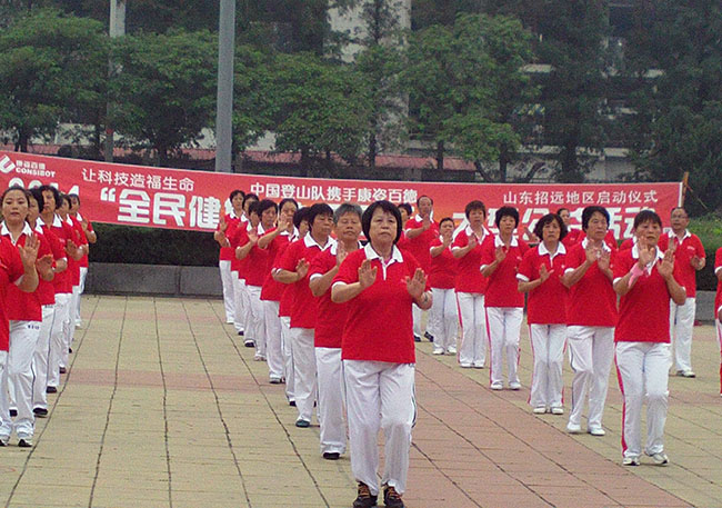 8月8日,山東招遠(yuǎn)的700多名康姿百德健身操愛(ài)好者和當(dāng)?shù)厥忻瘢谑姓畯V場(chǎng)載歌載舞,喜迎“全民健身日”,向人們倡導(dǎo)康姿百德公司提出的“健康睡眠+適量運(yùn)動(dòng)+合理飲食”的立體健康理念,傳遞著健康向上的正能量。 當(dāng)天上午8:30分,由當(dāng)?shù)乜底税俚聭敉饨∩頎I(yíng)組織舉辦的2014“全民健身 快樂(lè)同行”大型公益活動(dòng)招遠(yuǎn)地區(qū)啟動(dòng)儀式在這里隆重舉行,招遠(yuǎn)經(jīng)銷商向廣大市民宣布了本次活動(dòng)的目的和意義,當(dāng)?shù)乜底税俚陆∩頎I(yíng)隊(duì)員進(jìn)行了健身操表演,贏得了在場(chǎng)觀眾的普遍贊賞。大家一致認(rèn)為,康姿百德健身操節(jié)拍有力,動(dòng)作到位,音樂(lè)優(yōu)美,具有適宜人群廣泛、簡(jiǎn)單易學(xué)的特點(diǎn),是市民健身鍛煉的好項(xiàng)目,今后要加入到這個(gè)健身隊(duì)伍中,為推廣全民健身貢獻(xiàn)力量。 本次活動(dòng)得到了當(dāng)?shù)赜嘘P(guān)部門(mén)和媒體的重視,招遠(yuǎn)市老體協(xié)等單位領(lǐng)導(dǎo)出席了啟動(dòng)儀式,招遠(yuǎn)新聞對(duì)本次活動(dòng)進(jìn)行了報(bào)道。