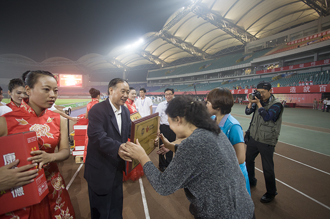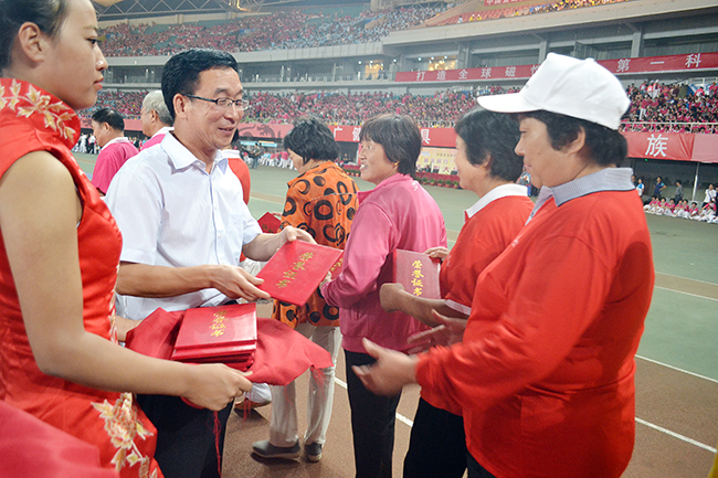 督導師進行紅旗表演 康姿百德健身操表演,是這次活動中檢閱和展示全民健身成果的重要內(nèi)容,也是最為引人注目的重頭戲。20多個省、市、自治區(qū)的8000多名康姿百德健身操愛好者,組成188個代表隊先后入場,表演隊伍浩浩蕩蕩、首尾相連,偌大的體育場瞬時變成一個舞的海洋。參賽隊員中年齡最大的72歲,最小的只有9歲,大家雖然經(jīng)歷了長途跋涉的旅途勞頓,但個個精神飽滿、熱情高漲,橫平豎直、整齊優(yōu)美的表演,帶給全場觀眾以美的享受,向人們傳遞著積極向上、健康文明的生活方式,贏得了全場觀眾的陣陣掌聲。經(jīng)過6個多小時的精彩表演,在評委們公正認真的打分評判下,比賽共產(chǎn)生一等獎2個,二等獎6個,三等獎9個。