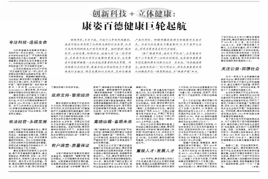 康姿百德視產(chǎn)品質(zhì)量為生命,通過(guò)可靠的產(chǎn)品質(zhì)量、誠(chéng)信的市場(chǎng)經(jīng)營(yíng)獲得了一系列社會(huì)榮譽(yù),得到了廣大消費(fèi)者的高度認(rèn)可。2016年3.15當(dāng)天,《中國(guó)消費(fèi)者報(bào)》用二分之一的版面對(duì)康姿百德公司進(jìn)行了大篇幅的報(bào)道,對(duì)康姿百德公司誠(chéng)信經(jīng)營(yíng)、銳意進(jìn)取的精神予以了肯定。