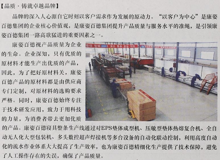 康姿百德視產(chǎn)品質(zhì)量為企業(yè)的生命。企業(yè)深知,只有優(yōu)質(zhì)的原材料才能生產(chǎn)出優(yōu)質(zhì)的產(chǎn)品,因此,為了把好原材料關(guān),康姿百德產(chǎn)品的原材料都是由供應(yīng)商專門定制,對原材料的選購要求嚴(yán)格。同時,康姿百德始終專注于技術(shù)研發(fā)應(yīng)用,致力于用科技的力量,為消費者帶去更加優(yōu)質(zhì)的產(chǎn)品。康姿百德寢具整條生產(chǎn)線通過對EPS墊體成型機、壓敏型墊體熱熔復(fù)合機、全自動無人化大型包裝機、多頭數(shù)控超聲焊接機等多臺設(shè)備的自動化聯(lián)動控制,利用高度自動化的流水作業(yè)體系大大提高了生產(chǎn)效率,也為康姿百德精細化生產(chǎn)提供了技術(shù)保障,避免了人工操作存在的失誤,確保了產(chǎn)品質(zhì)量。
