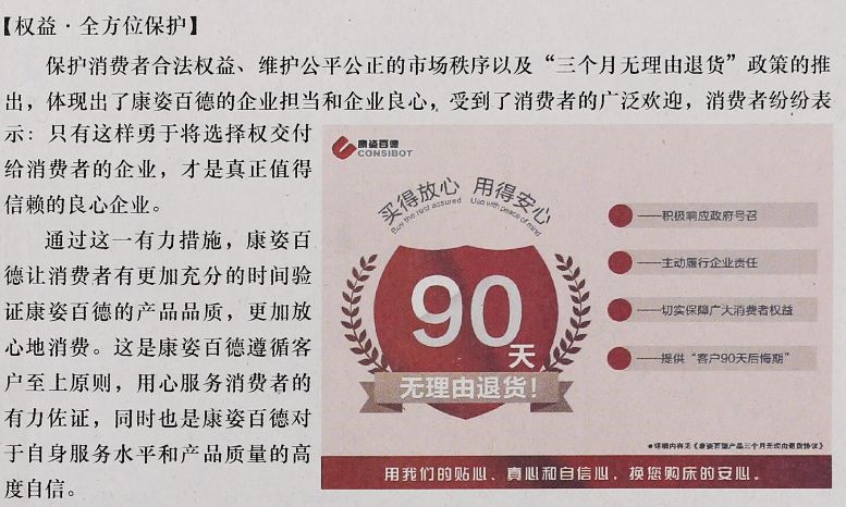 【權(quán)益·全方位保護】保護消費者合法權(quán)益、維護公平公正的市場秩序以及“三個月無理由退貨”政策的推出,體現(xiàn)出了康姿百德的企業(yè)擔(dān)當(dāng)和企業(yè)良心,受到了消費者的廣泛歡迎,消費者紛紛表示:只有這樣勇于將選擇權(quán)交付給消費者的企業(yè),才是真正值得信賴的良心企業(yè)。