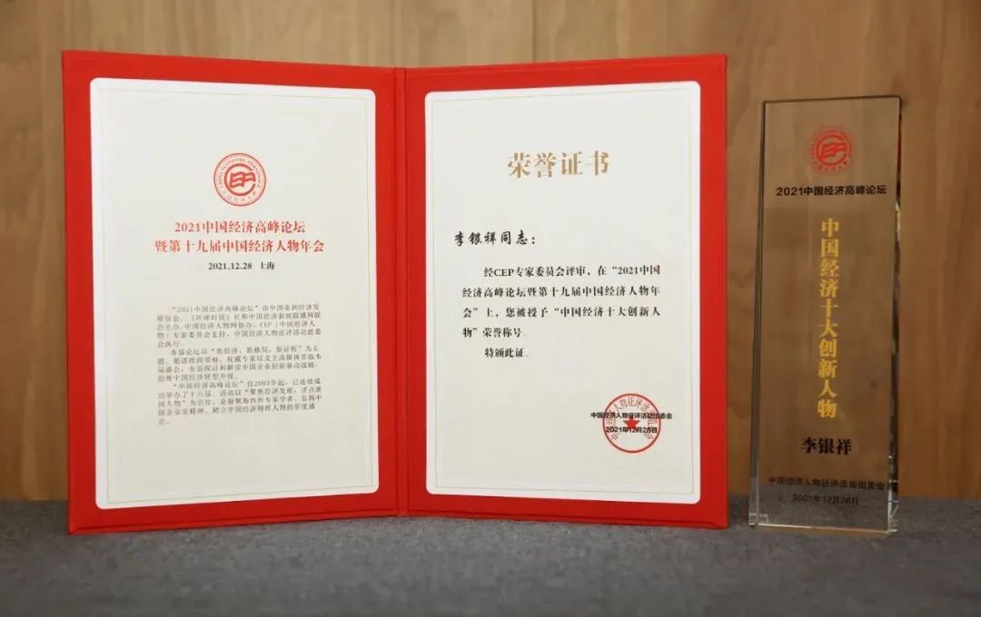 “中國(guó)經(jīng)濟(jì)十大創(chuàng)新人物”榮譽(yù)獎(jiǎng)杯和證書(shū)