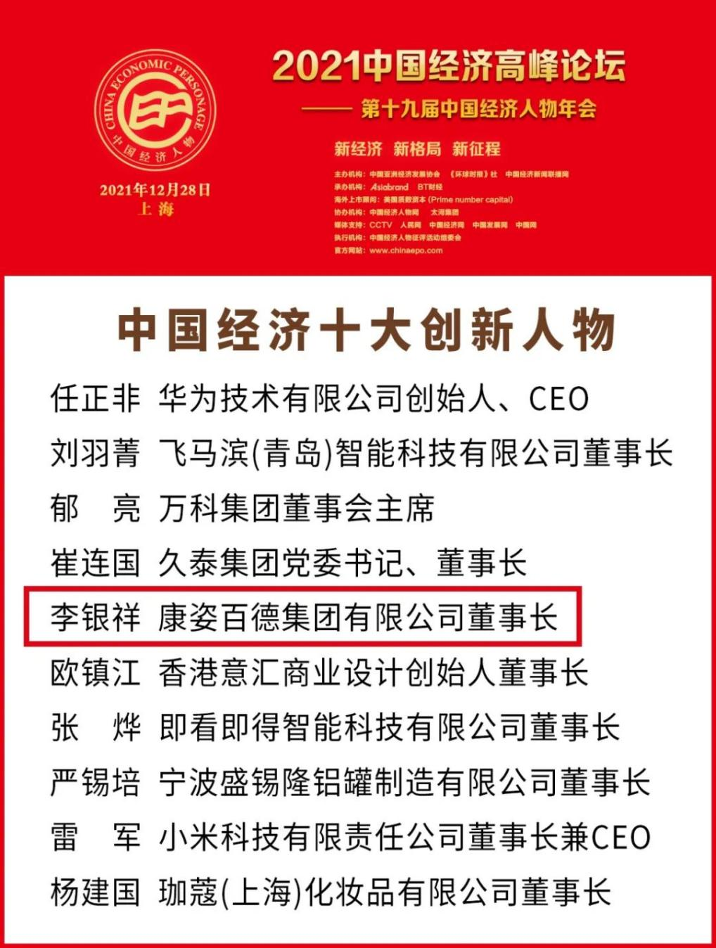 2021年12月28日,“2021中國(guó)經(jīng)濟(jì)高峰論壇暨第十九屆中國(guó)經(jīng)濟(jì)人物年會(huì)” 在上海成功舉行。本次活動(dòng)由中國(guó)經(jīng)濟(jì)新聞聯(lián)播網(wǎng)、《環(huán)球時(shí)報(bào)》社、中國(guó)亞洲經(jīng)濟(jì)發(fā)展協(xié)會(huì)聯(lián)合主辦。康姿百德集團(tuán)董事長(zhǎng)李銀祥榮獲“中國(guó)經(jīng)濟(jì)十大創(chuàng)新人物”榮譽(yù)稱(chēng)號(hào)。