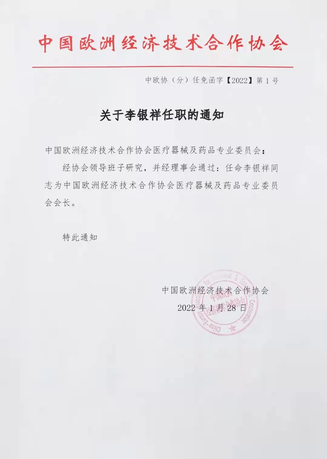 中國(guó)歐洲經(jīng)濟(jì)技術(shù)合作協(xié)會(huì)醫(yī)療器械及藥品專業(yè)委員會(huì)(以下簡(jiǎn)稱“中歐協(xié)會(huì)醫(yī)療器械及藥品專業(yè)委員會(huì)”),以關(guān)注國(guó)內(nèi)外相關(guān)行業(yè)政策、定期組織醫(yī)療器械和藥品企業(yè)進(jìn)行國(guó)際交流活動(dòng)等為主要內(nèi)容,構(gòu)筑了中國(guó)與歐洲醫(yī)療器械行業(yè)之間交流合作的橋梁。該協(xié)會(huì)隸屬于中歐協(xié)會(huì), 接受中歐協(xié)會(huì)的業(yè)務(wù)指導(dǎo)和監(jiān)督管理。李銀祥董事長(zhǎng)的當(dāng)選充分說(shuō)明了我們?cè)谙嚓P(guān)協(xié)會(huì)的影響力。