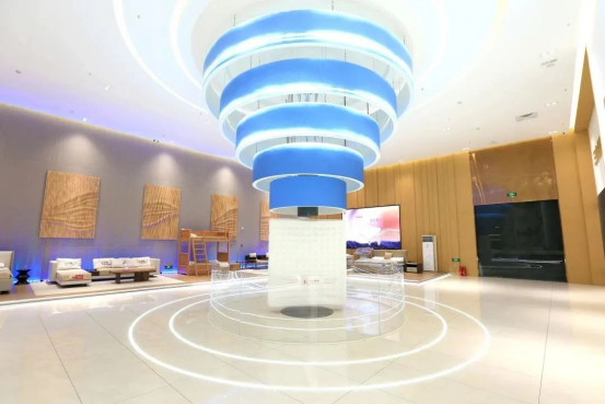 科技展廳的產(chǎn)品展示區(qū),以“科技感”與“舒適睡眠”為設(shè)計導(dǎo)向,圍繞“溫暖”“家”“科技”幾個核心元素,實現(xiàn)了科技元素與家居生活的有機結(jié)合,構(gòu)建一個家庭場景式的沉浸空間,一個有溫度的展示環(huán)境。