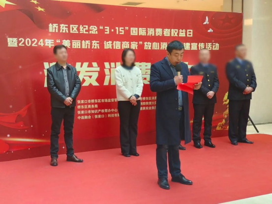 3月15日上午,張家口橋東區(qū)市場監(jiān)督管理局、張家口橋東區(qū)消費者權(quán)益保護委員會聯(lián)合舉辦了“315國際消費者權(quán)益日”的主題活動??底税俚聫埣铱诘貐^(qū)總經(jīng)理安峰逸作為優(yōu)秀企業(yè)代表,受邀出席本次活動并講話。