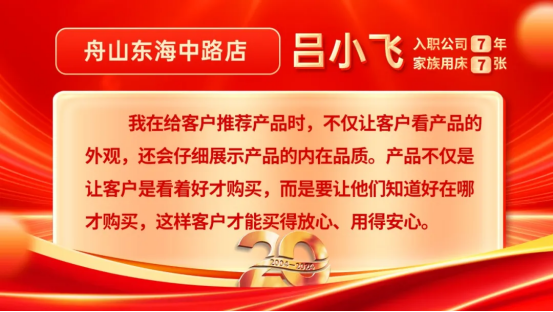 今年是康姿百德集團成立20周年。在20年的發(fā)展歷程中,有這樣一群人,他們在市場經(jīng)營管理過程中,深刻貫徹以客戶為中心的理念,始終把優(yōu)質(zhì)的服務(wù)融于門店經(jīng)營的每個環(huán)節(jié),也因此得到了客戶的贊賞和認可。他們就是康姿百德專賣店的員工。本期和您分享的是康姿百德浙江地區(qū)專賣店員工代表的故事。