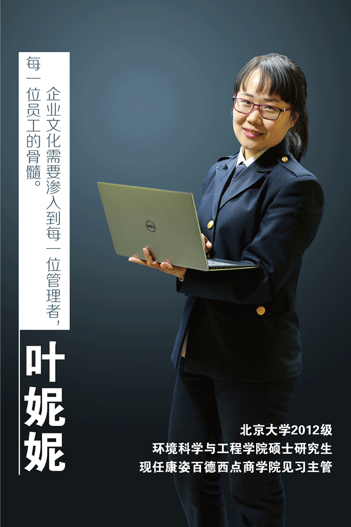 葉妮妮,北京大學(xué)2012級(jí)環(huán)境科學(xué)與工程學(xué)院碩士研究生,現(xiàn)任康姿百德西點(diǎn)商學(xué)院見(jiàn)習(xí)主管。
